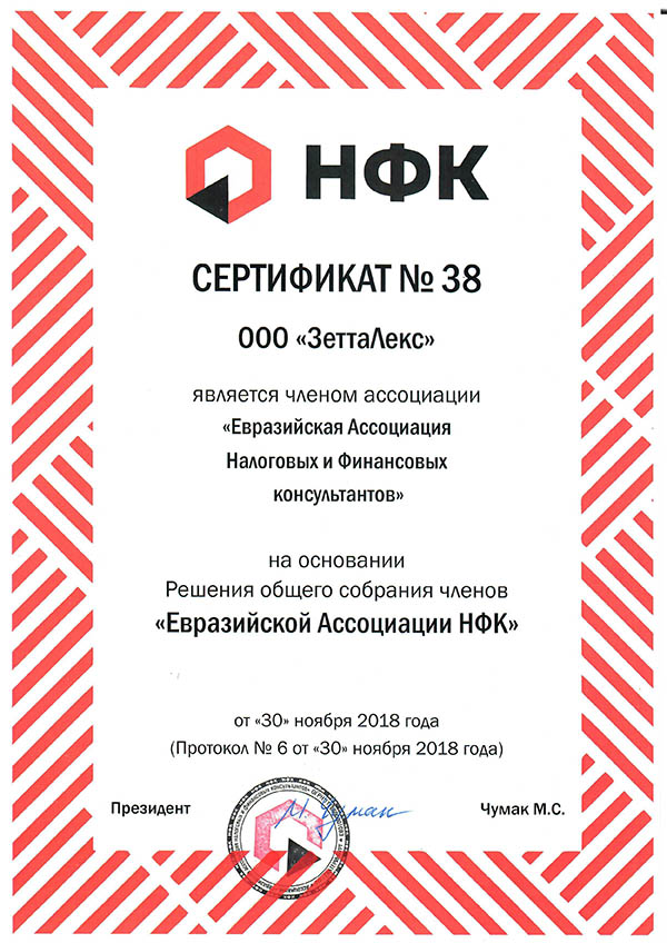 ООО "ЗеттаЛекс" является членом ассоциации "Евразийская ассоциация Налоговых и Финансовых консультантов".